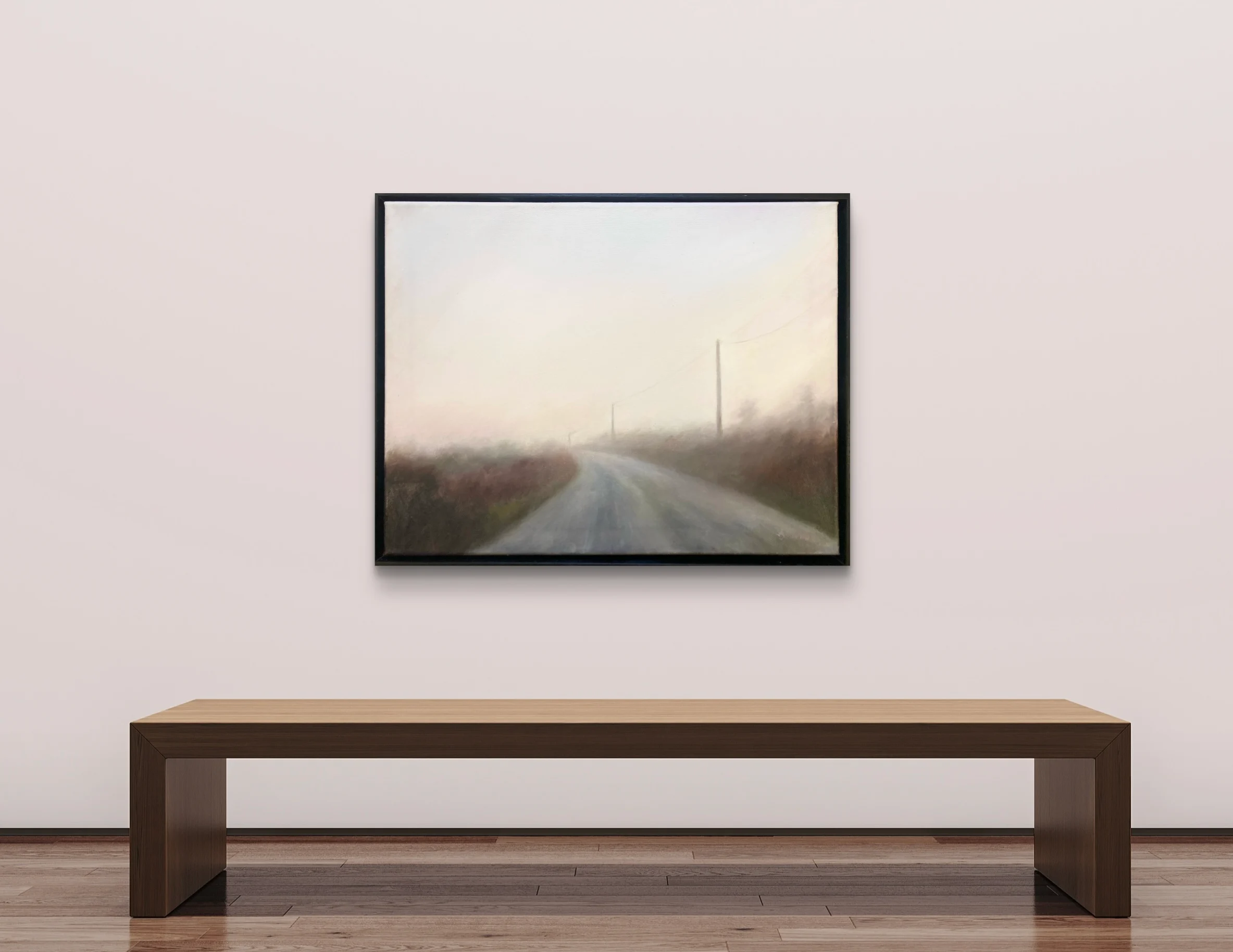 This original oil painting depicts a quiet road disappearing into fog in the Wicklow countryside. Soft morning light and a restrained palette emphasise atmosphere and depth, allowing the viewer’s eye to move gently into the distance.